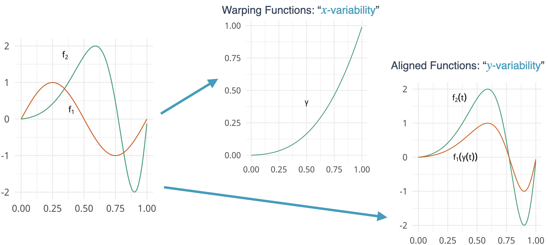 - One problem occurs when performing these types of analysis is that functional data can contain variability in time (x-direction) and amplitude (y-direction)