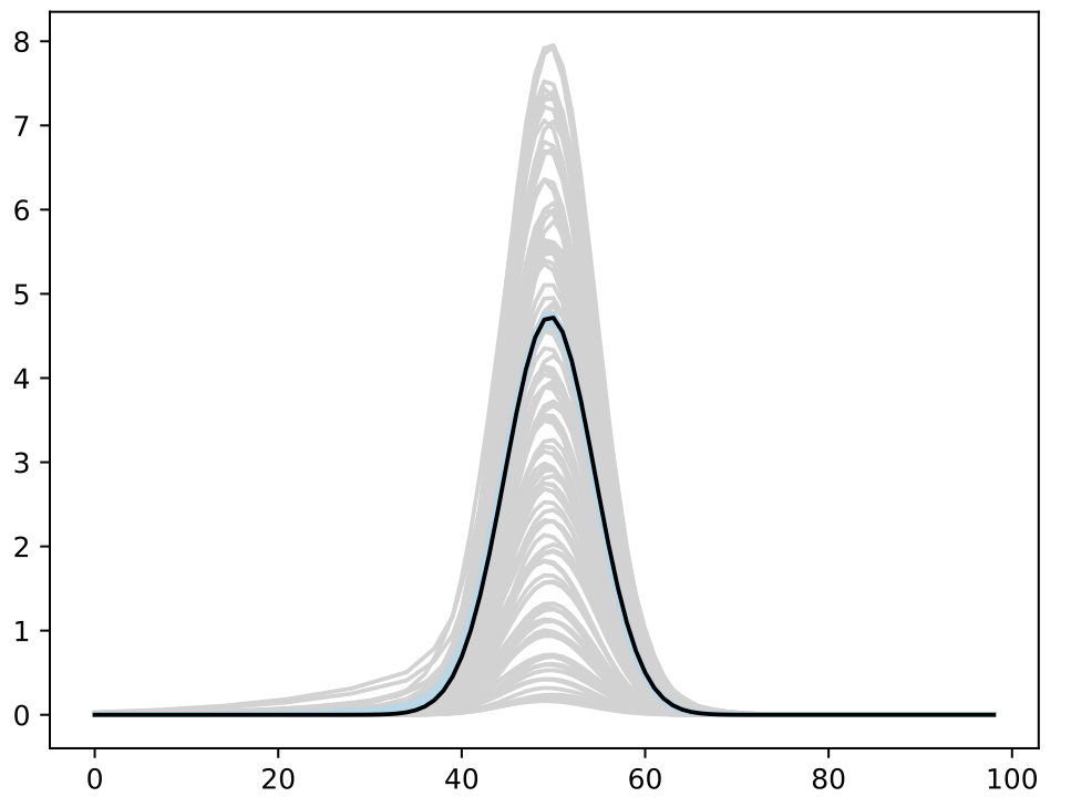 - Calibrate the aligned data and shooting vectors using the following model \[y^E(t^*) = y^M(t^*,\theta)+\delta_y(t^*)+\epsilon_y(t^*),~\epsilon_y(t^*)\sim\mathcal{N}(0,\sigma_y^2I)\] \[v^E = v^M(\theta) + \delta_v + \epsilon_v,~\epsilon_v\sim\mathcal{N}(0,\sigma_v^2I)\]