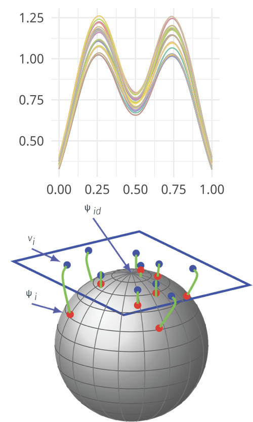 - To facilitate modeling, we transform the warping functions into shooting vector space with \[v_i^E = \exp_\psi^{-1}\left(\sqrt{\dot{\gamma}_i^E}\right)\] \[v^M(x) = \exp_\psi^{-1}\left(\sqrt{\dot{\gamma}^M(x)}\right)\]