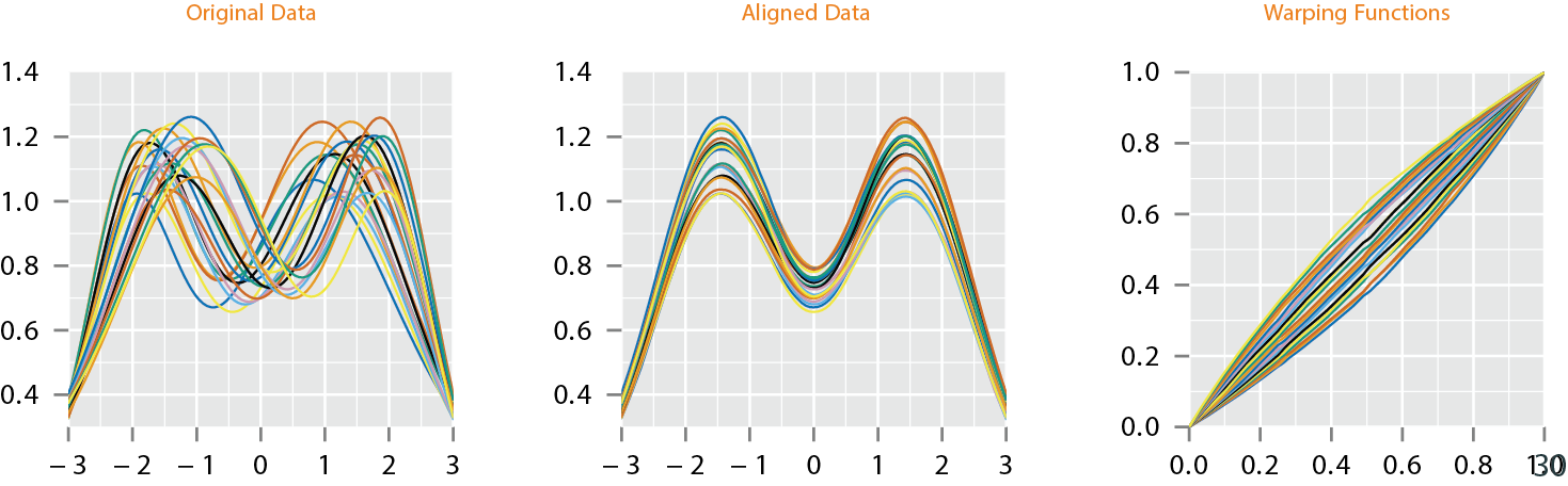 - One problem occurs when performing these type of analyses is that functional data can contain variability in time (\(x\)-direction) and amplitude (\(y\)-direction)