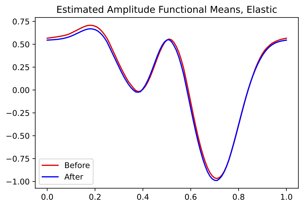 - Alignment is performed by finding the empirical Karcher mean \[ \mu_q = \mathop{\mathrm{arg\,min}}_{q \in {\mathbb{L}^2}} \sum_{i=1}^n \left( \inf_{\gamma_i \in \Gamma} \| q - (q_i, \gamma_i) \|^2 \right)\]